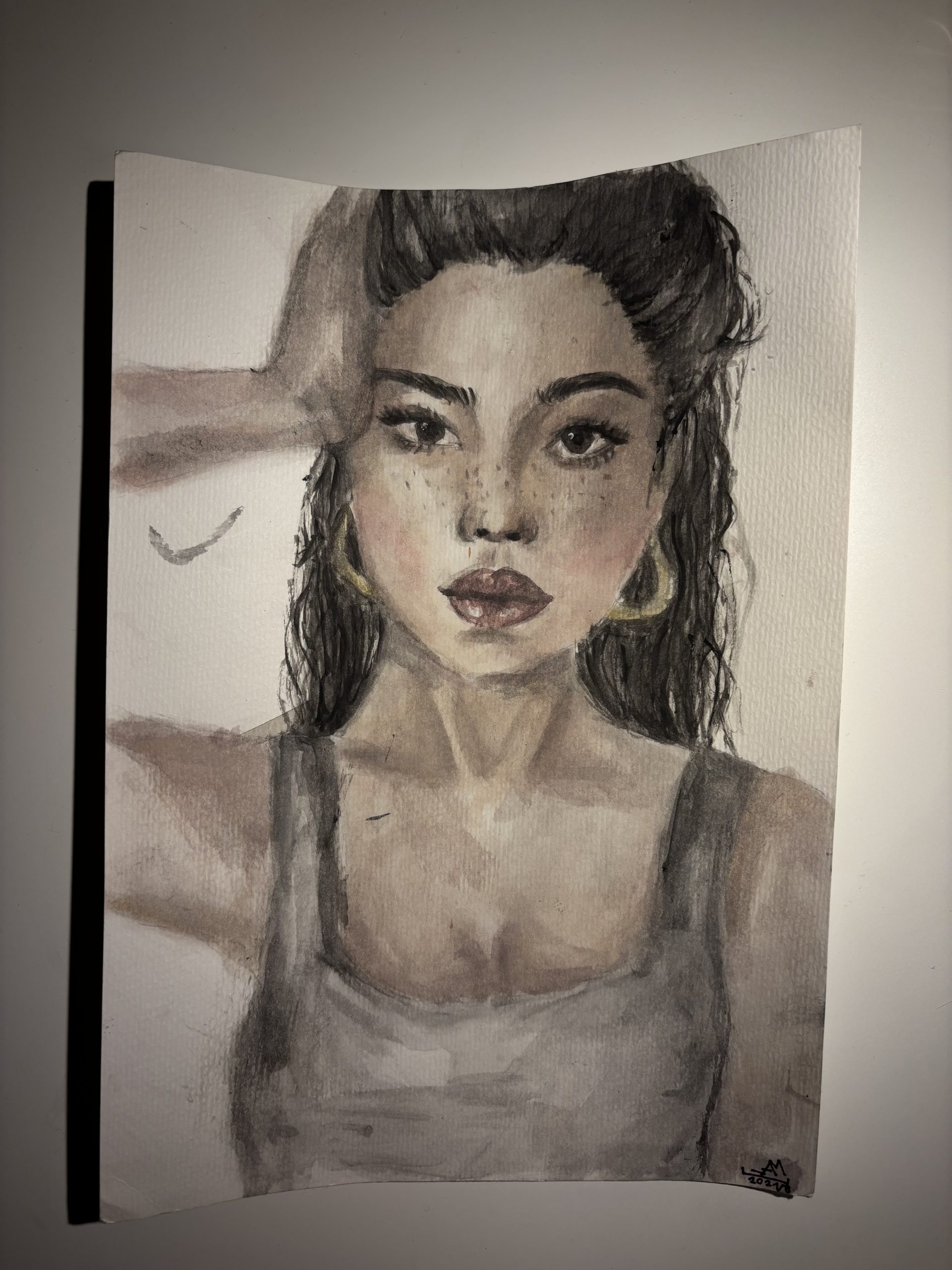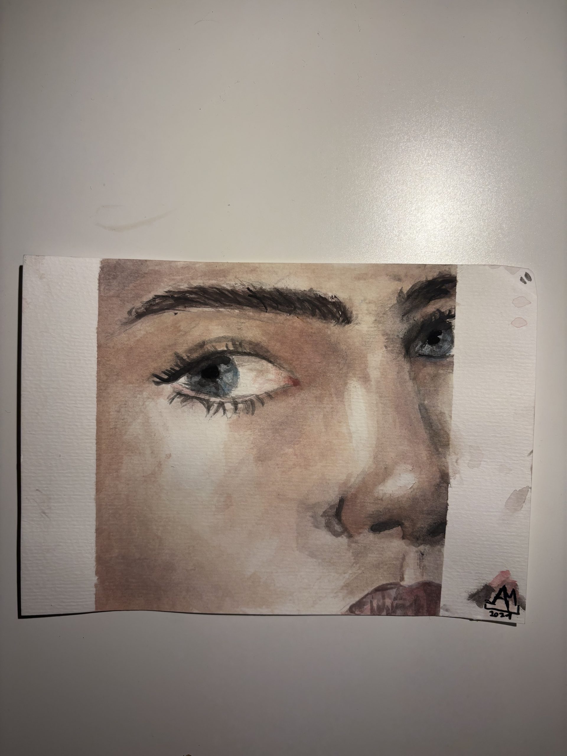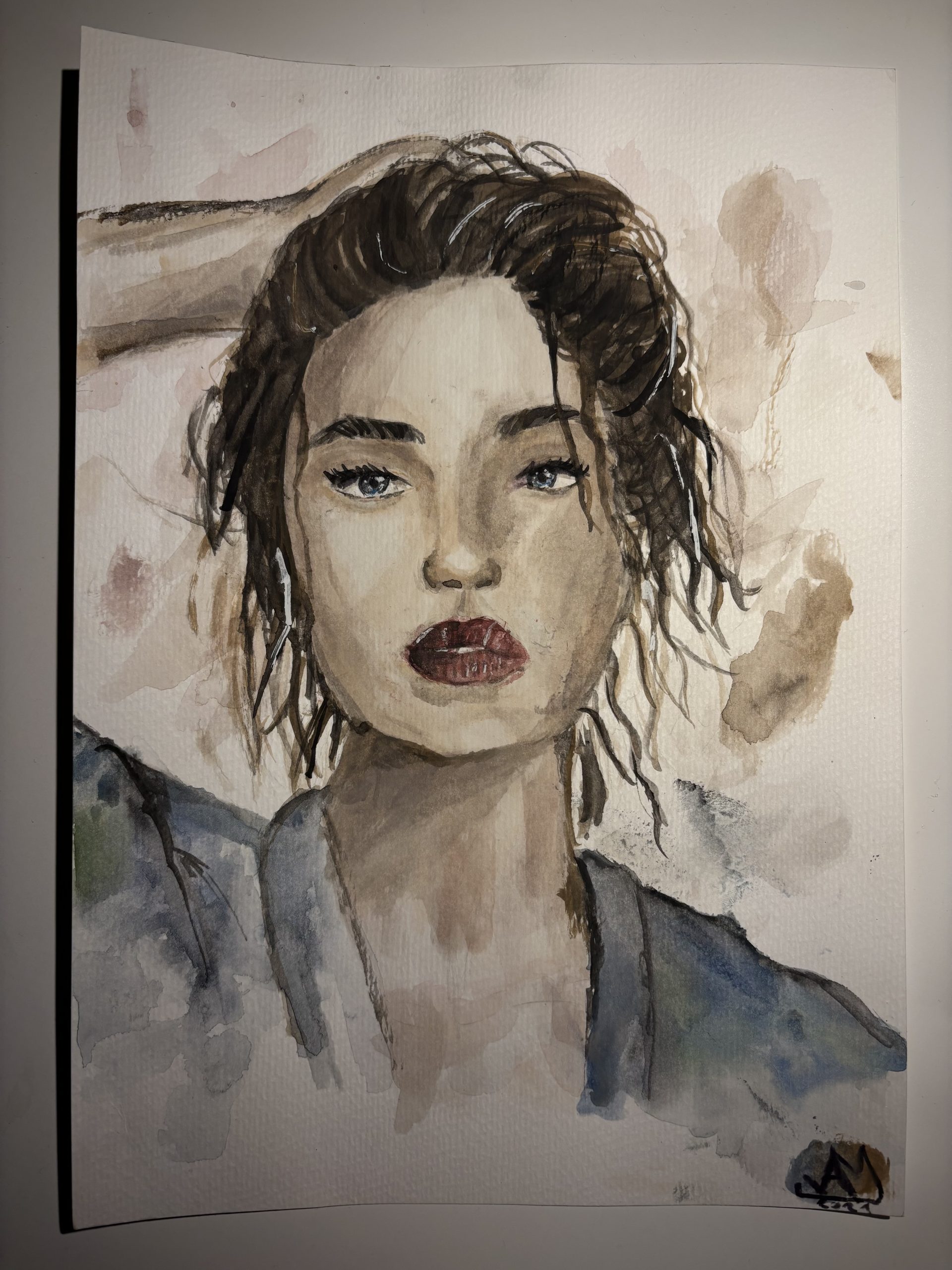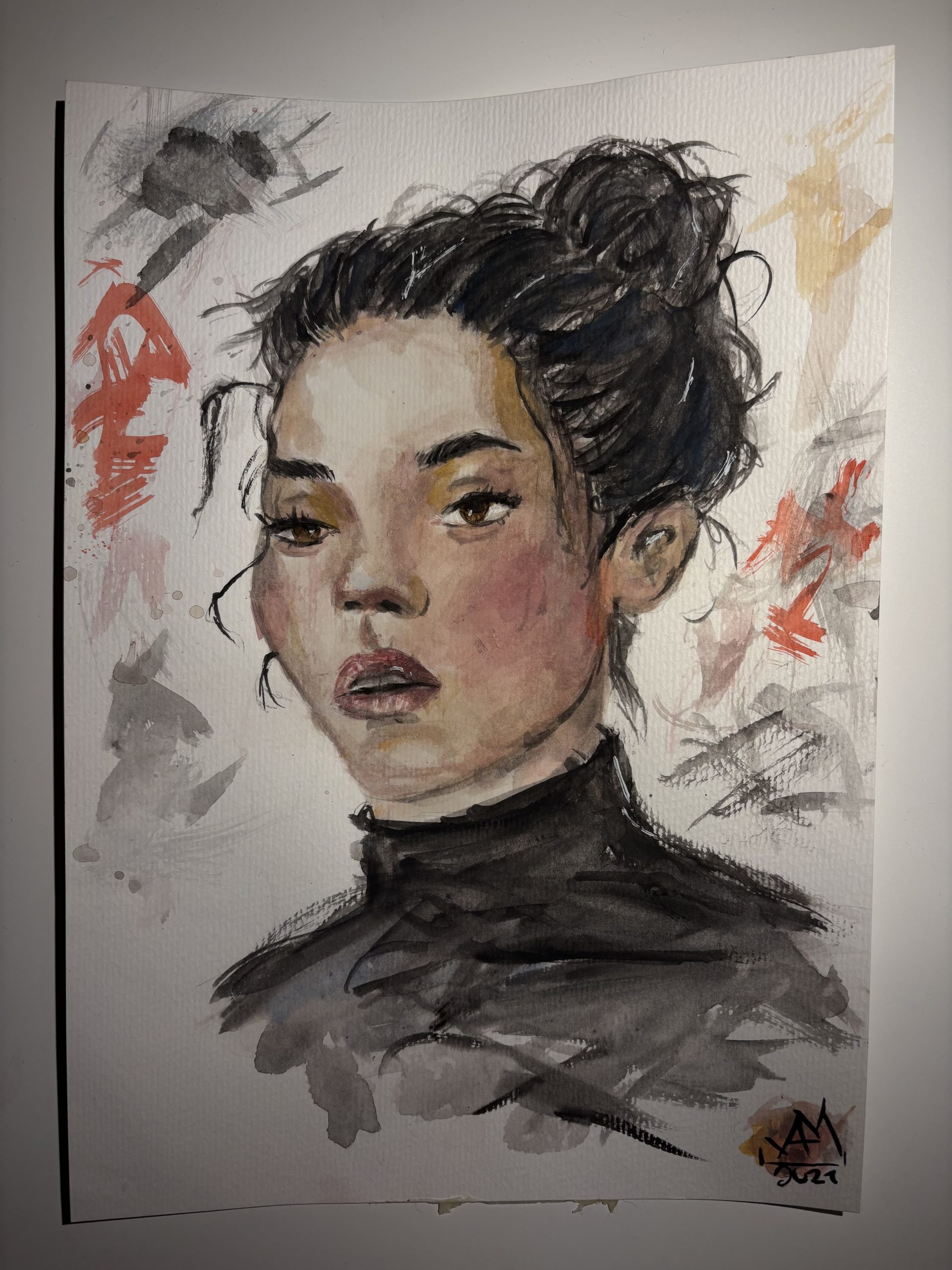Ich male, seit ich vier Jahre alt bin – zuerst mit Bleistift, Buntstift und Wasserfarben. Mit zwölf Jahren, 2017-2018, bekam ich Aquarellfarben geschenkt und begann, meine ersten Portraits auf A4-Leinwänden zu malen. Seitdem liegt mein Fokus ganz auf Portraits, und ich habe meine Liebe zu ausdrucksstarken Gesichter entdeckt.